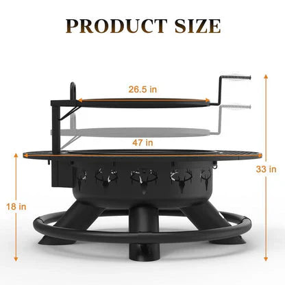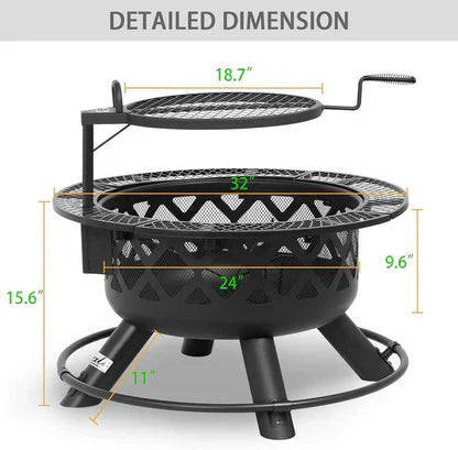 - Safe and Reliable: With built-in handles, the outdoor fire pit with grill can be easily rotated 360 degrees and adjusted up and down in height. And the stable round support structure makes wood burning fire pit safer to use. It provides a safe experience